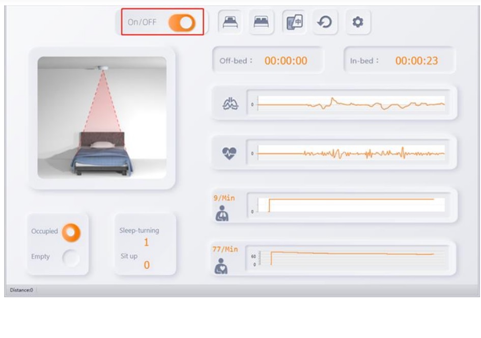 - Phát hiện và xuất thông tin về việc cơ thể con người có nằm trên giường hay không đến phần mềm máy khách được kết nối. Đếm thời gian