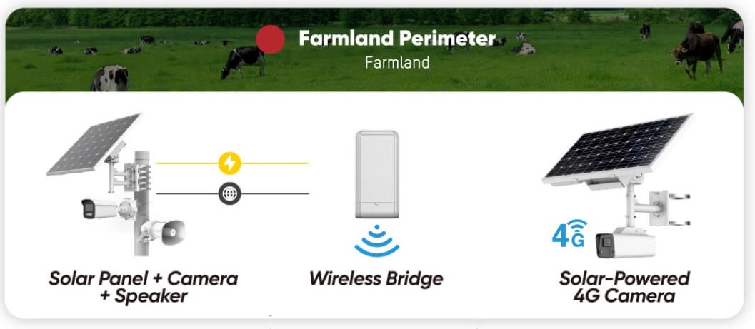 - Cánh đồng hay trang trại là khu vực vô cùng rộng lớn, rất khó khăn trong việc bảo vệ an ninh. Số lượng gia súc, gia cầm nhiều nên việc theo dõi sức khỏe và sản lượng vật nuôi bị hạn chế. Camera năng lượng mặt trời là biện pháp hiệu quả để phát hiện xâm nhập, trộm cắp xung quanh, theo dõi tình hình vật nuôi tại khu vực nông trại đó. Khi phát hiện sự việc bất thường, camera sẽ phát tín hiệu cảnh báo khẩn cấp đến người quản lý trang trại để họ kịp thời xử lý.
